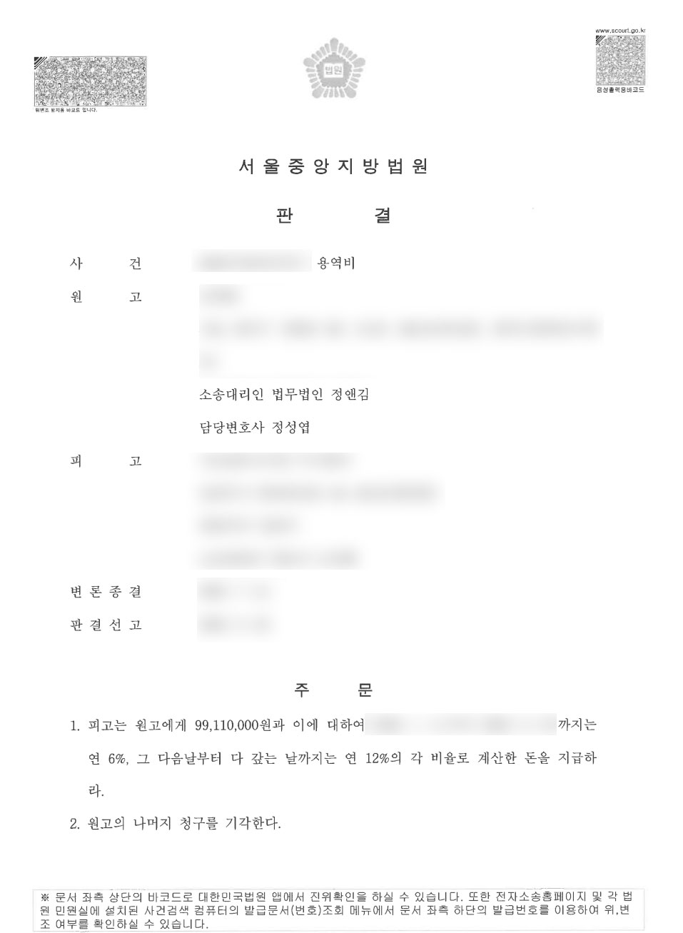 [법무법인 정앤김의 조력]