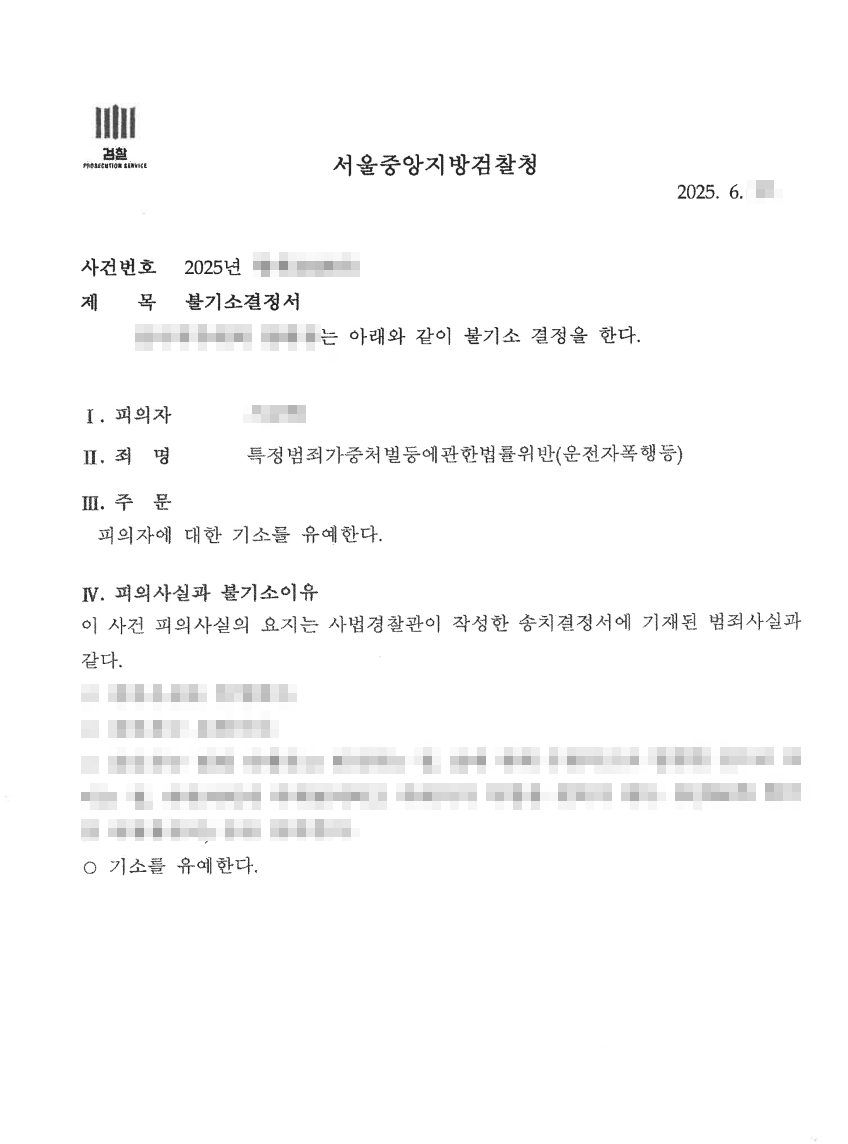 운전자폭행은 사회적으로 엄중하게 다뤄지는 범죄로, 자칫하면 실형까지 선고될 수 있는 중대한 사안입니다. 하지만 사건의 초기 대응부터 피해자와의 합의, 피의자의 상황에 대한 충분한 소명까지 치밀하게 준비한다면, 이처럼 기소유예 처분과 같은 선처를 이끌어낼 수 있습니다.