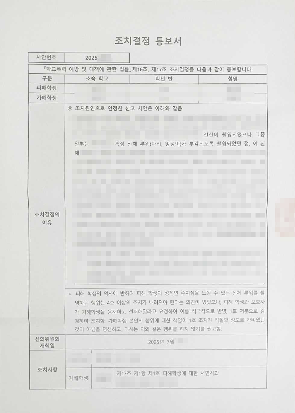 - 촬영의 맥락과 영상의 구체적 내용 등을 고려하여 1호 서면사과 처분으로 감경되는 결과를 이끌어냈습니다.