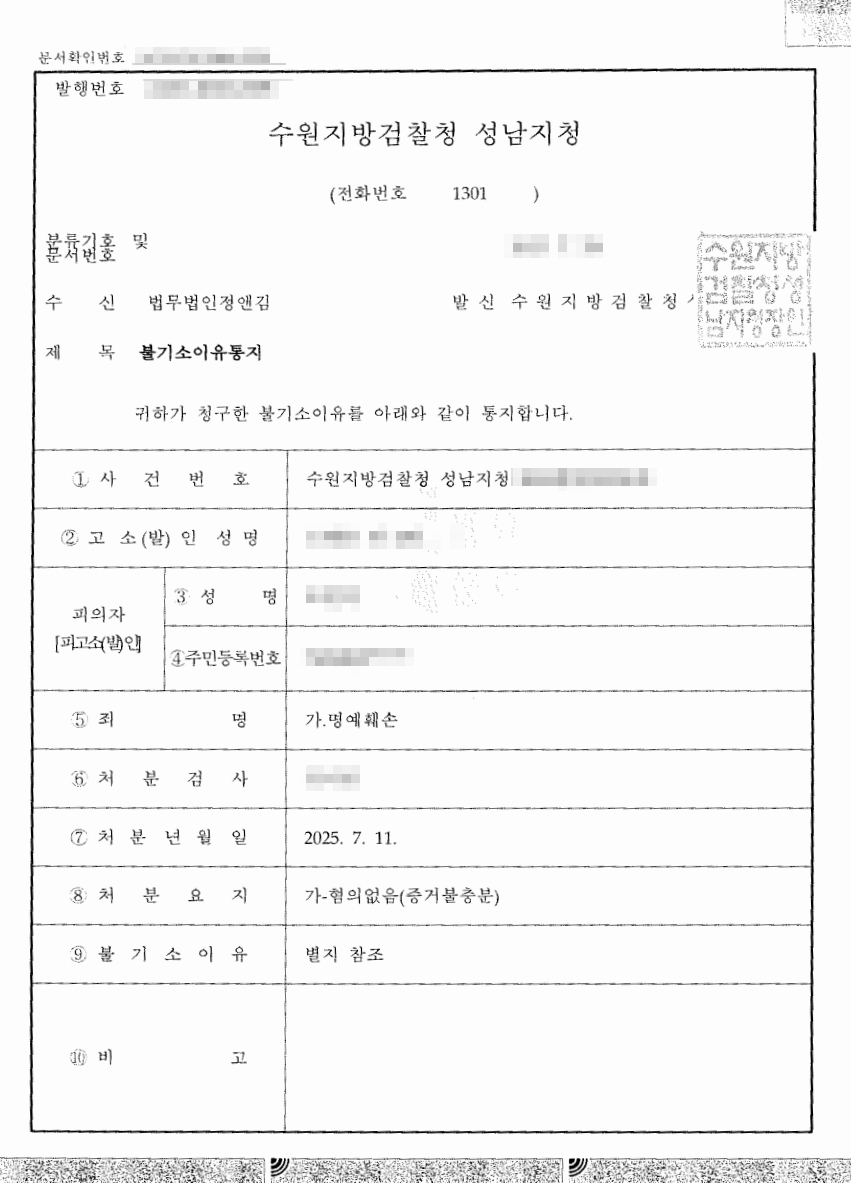 의뢰인은 정성엽 변호사와 함께 5시간에 이르는 검찰 조사에 성실히 임하였고, 변호인은 의견서를 제출하여 위의 주장을 적극적으로 피력하였습니다. 그 결과, 수사기관은 본 사안에서 ‘공연성’을 인정하기에 부족하고 이를 뒷받침할 증거 또한 없다는 이유로, 증거불충분에 의한 혐의없음 처분을 내렸습니다.
