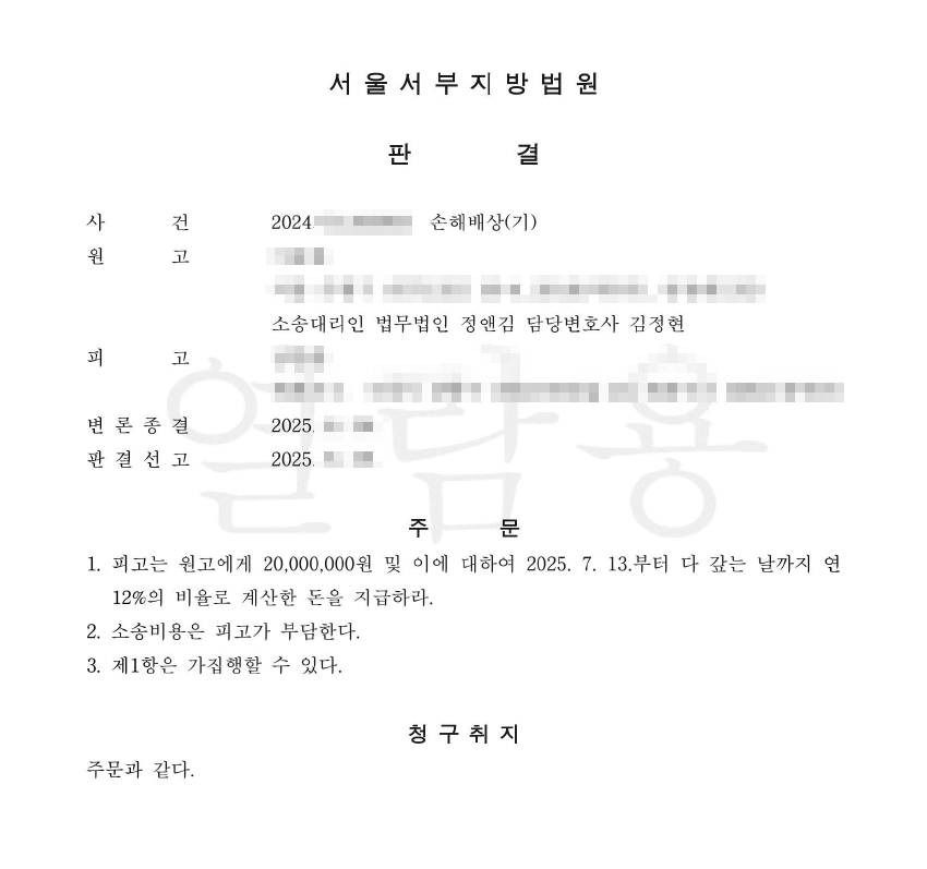 피고는 원고의 소송을 피하기 위하여 의도적으로 소장 송달을 받지 않았고, 수차례의 주소보정과 각종 송달을 거친 후에야 사건을 진행할 수 있었습니다. 피고는 재판기일이 지정된 이후에도 소송에 대응하지 않았고 결국 원고는 청구했던 취지 그대로 20,000,000원을 지급받는 것으로 판결을 받을 수 있었습니다.