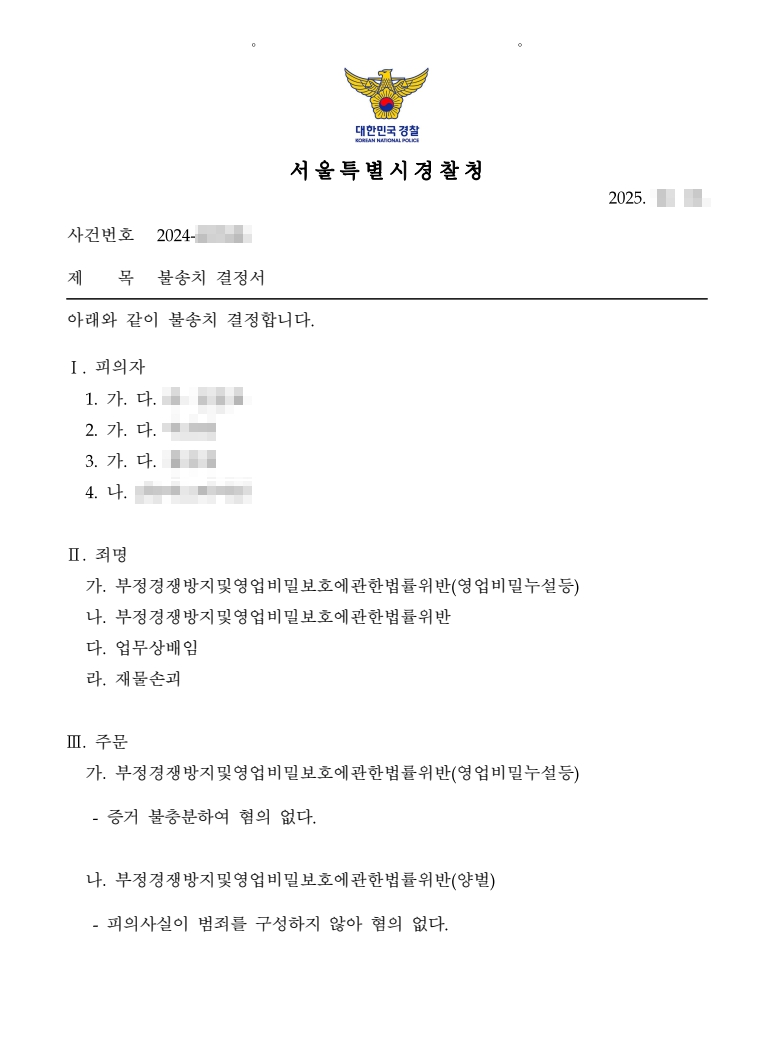 이에 따라 부정경쟁방지 및 영업비밀보호에 관한 법률위반, 업무상배임, 재물손괴 모두 ‘혐의없음(증거불충분)’ 처분이 내려졌습니다.