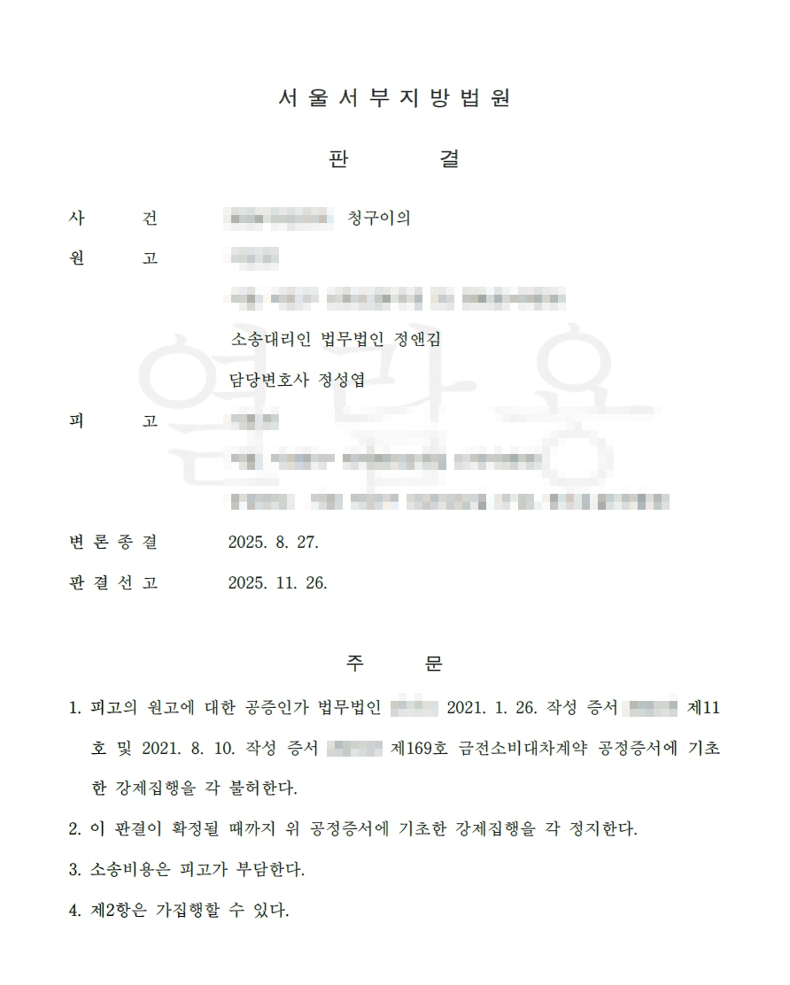 법무법인 정앤김은 실질적 채무관계 분석과 법정 이율 적용만으로도 공정증서를 무력화할 수 있음을 입증했습니다.