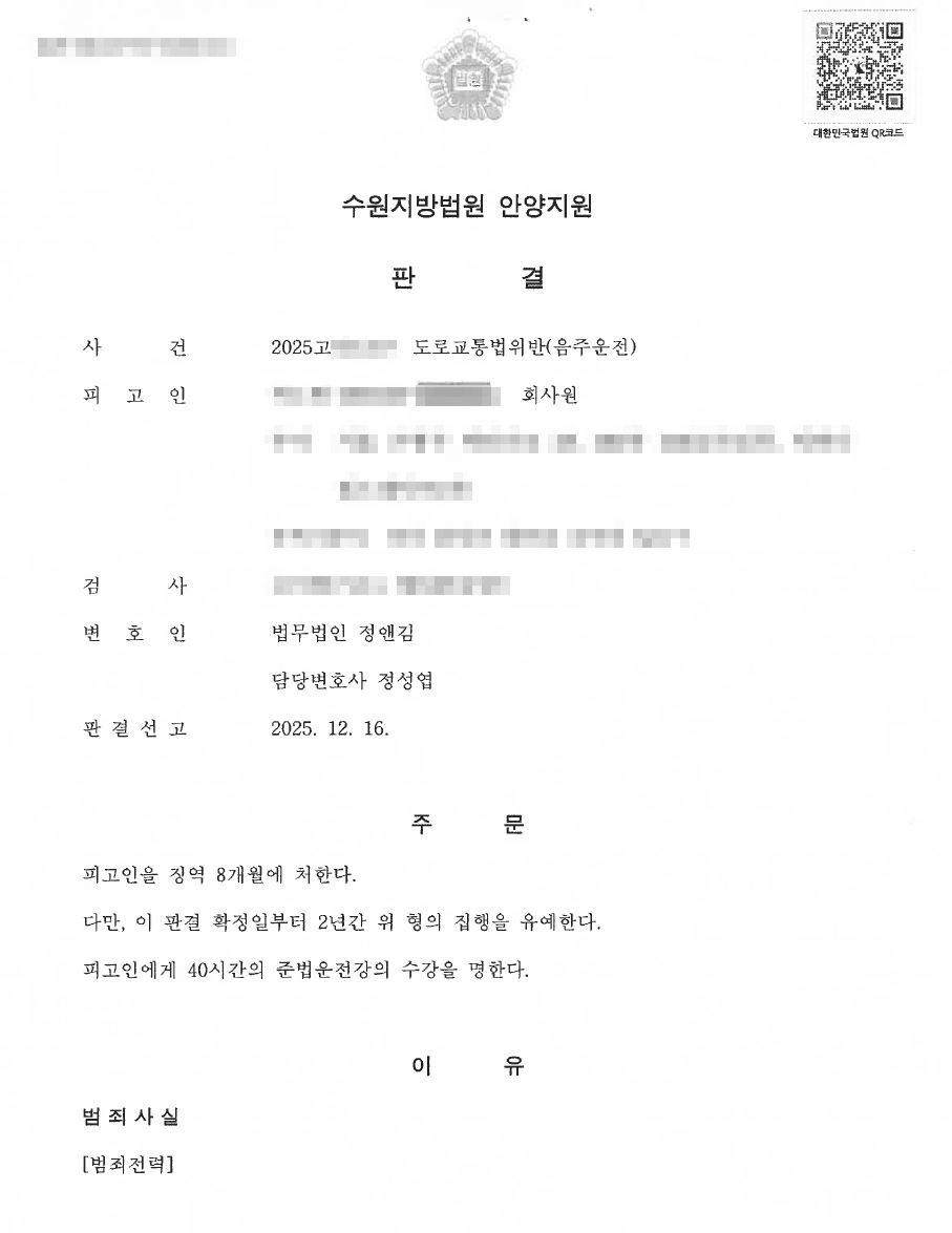 재판부는 피고인에게 징역 8개월을 선고하되, 판결 확정일부터 2년간 그 집행을 유예하고, 40시간의 준법운전강의 수강을 명령했습니다.