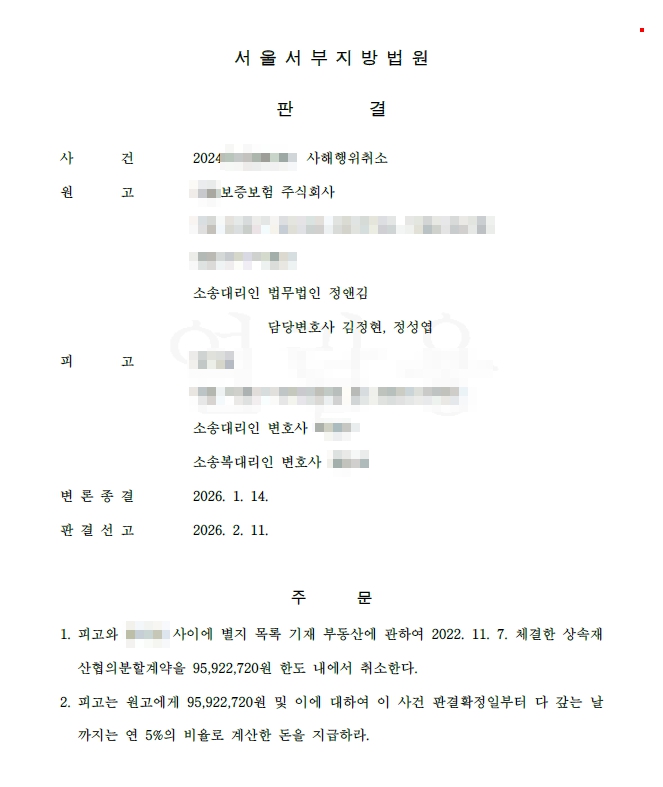 또한, 법무법인 정앤김은 상속재산분할협의 이후 다른 채권자가 사해행위에 따른 가액배상으로 1,500만 원을 지급받은 사실이 있으므로 원상회복의 방법은 가액배상이 되어야 한다는 점을 주장하여 재판부를 설득하였습니다.