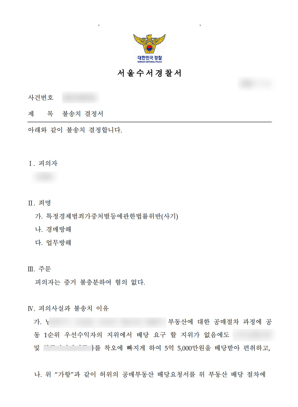 법무법인 정앤김의 정성엽 변호사는, 피의자는 약정서에 기재한 바와 같이 우선수익권을 통해 5억 5천만 원을 추가로 배당받아 간 점, 이에 따라 피의자는 피해자나 신탁회사에 대한 어떠한 기망행위도 없는 점, 신탁회사의 금융기관에 대한 고지 철자가 잘못되었다고 하더라도 그 부분은 신탁회사의 과실에 해당하는 점, 피해자는 신탁회사에 어떠한 이의도 제기하지 않은 점, 설사 위 부분이 신탁회사의 잘못이 아니라 피의자의 잘못이라고 하더라도 형사절차가 아닌 민사절차를 통해 해결해야 한다는 점을 강조하였습니다. 또한, 회사의 배후에 있는 자가 회사의 법인격을 남용한 경우, 회사는 물론 그 배후자에 대해서도 회사의 행위에 관한 책임을 물을 수 있다는 이유를 들어 최종적으로 '혐의 없음'처분 불송치결정을 받았습니다.