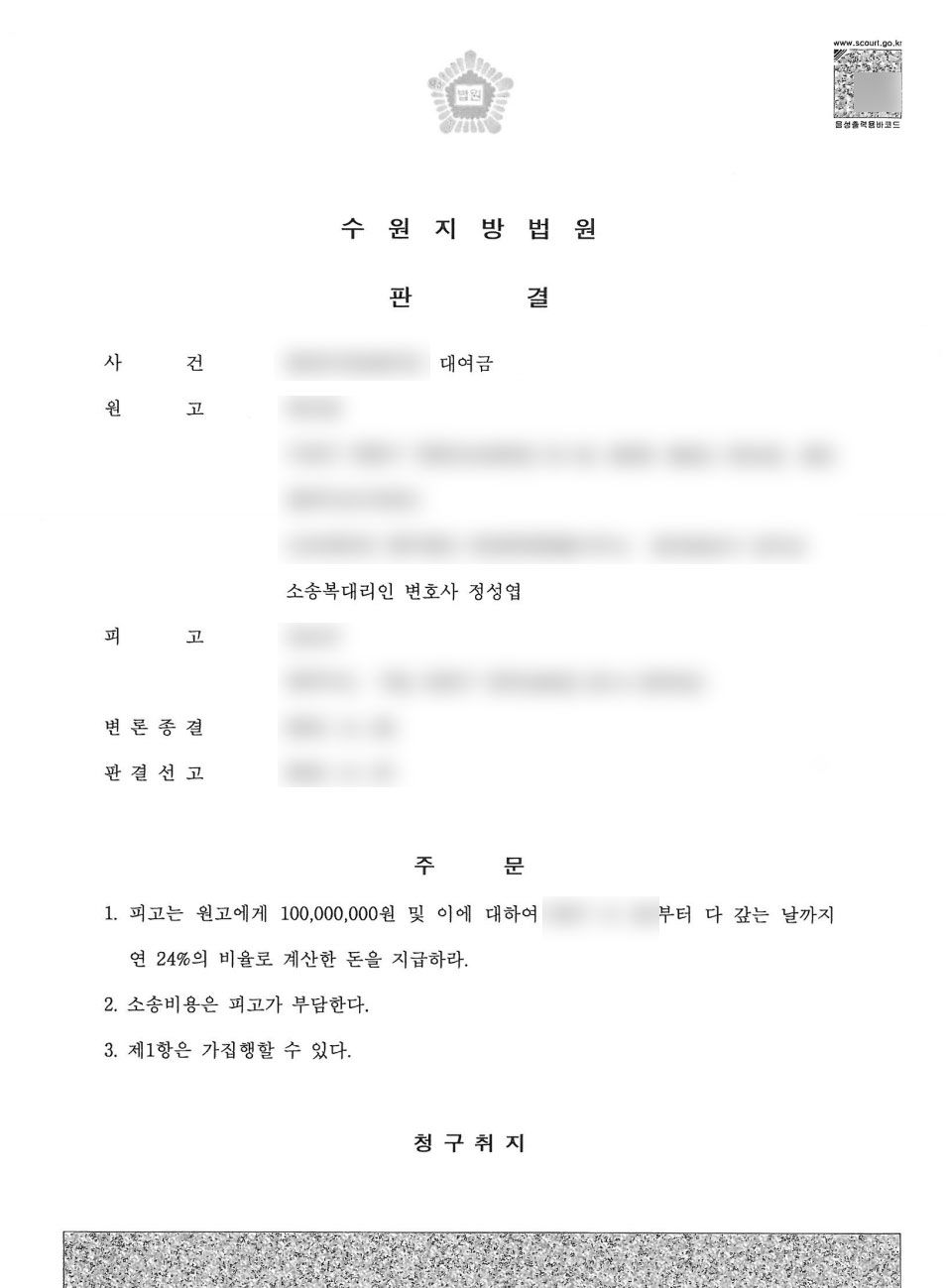 법무법인 정앤김은 차용증과 같은 처분문서가 없었지만 원고는 피고로부터 이자를 몇 개월 동안 지급받은 점, 시공사인 피고에게 추가로 돈을 입금할 필요가 없는 점 등을 주장하여 원고의 피고에 대한 청구가 모두 인용되었습니다.