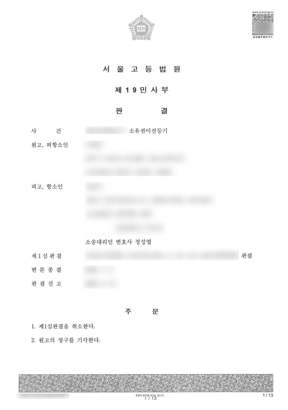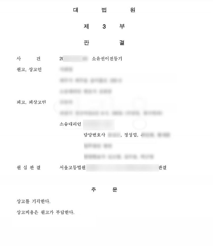 결국 2심에서 명의신탁약정이 인정되지 않는다는 점을 입증하여 피고(의뢰인) 전부 승소를 이끌어내었습니다. 하지만 원고측에서 이를 받아들이지 않아 결국 사건은 대법원까지 가게되었고, 대법원(상고) 역시 2심과 같은 결과로 사건을 마무리 짓게 되었습니다.