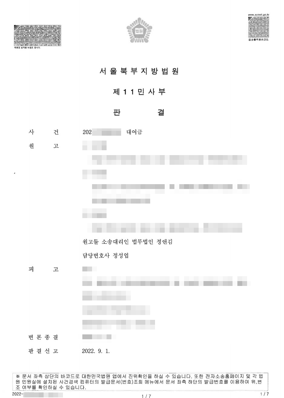 법무법인 정앤김의 정성엽 변호사는 사실조회 신청과 금융거래 정보 제출명령 등을 통해 원고들과 피고, A 사이의 자금 흐름을 입증하였고 결국 대여금의 19/20에 대한 연 5%의자를 지급받는 판결을 이끌어냈습니다.