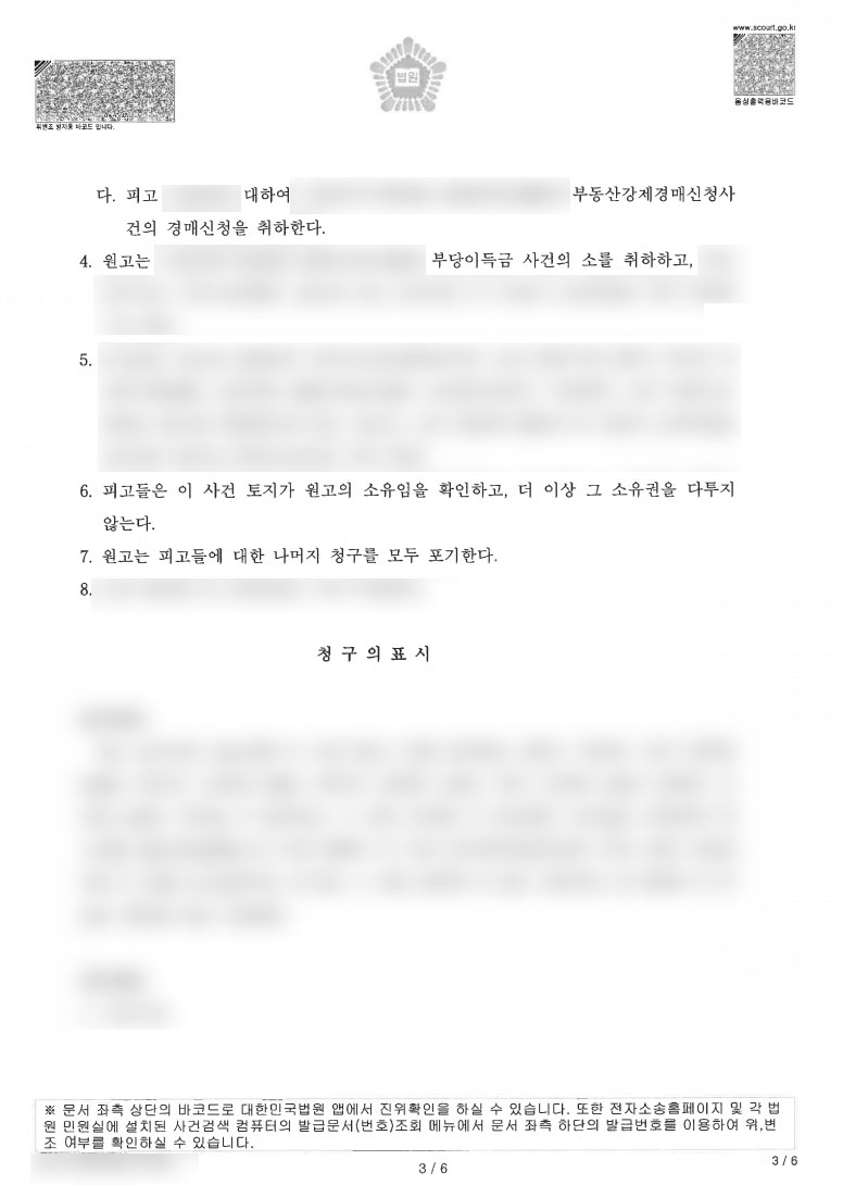 4번의 조정기일이 열렸고, 피고들은 이 사건 임야를 인도하는 것에 협조하되 원고의 피고들에 대한 불법행위 손해배상 청구는 포기하는 것으로 조정이 성립되었습니다.