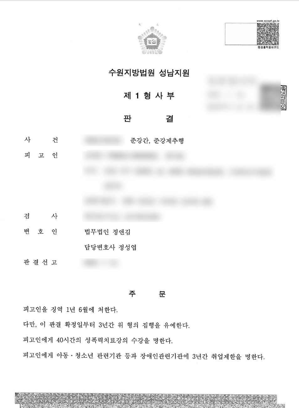 법무법인 정앤김은 가장 먼저 피해자와 합의를 이끌어내어 처벌불원서를 제출하였고, 피고인이 선의로 피해자를 부축한 후 휴식을 취하는 과정에서 피해자와 합의 하에 성관계를 가진다는 인식으로 공소사실과 같은 행위를 한 것이라는 점, 피고인이 피해자의 심신상실 또는 항거불능 상태를 인식하고 이를 적극적으로 이용해 간음하려고 하지 않은 점 등을 주장하여 집행유예를 이끌어낼 수 있었습니다.