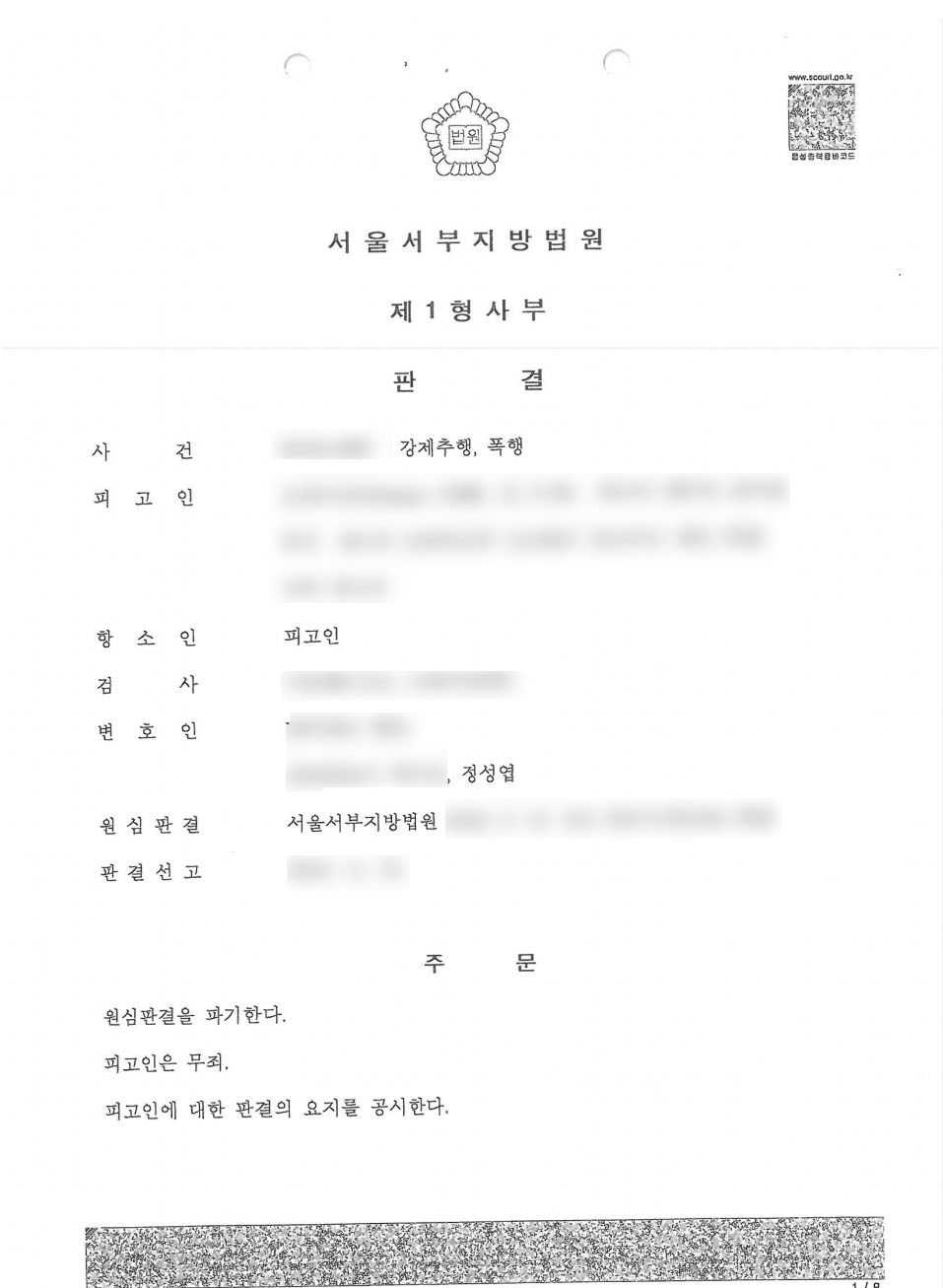 정성엽 변호사는 억울함을 호소하는 의뢰인을 외면할 수 없어 사건을 맡았고, 증거자료를 수백 회 검토하고 현장에 직접 나가 사건을 살펴보며 결국 의뢰인의 주장을 뒷받침해 줄 증거를 찾아내었습니다. 1심 때 증거로 제출되었던 CCTV 영상은 화질이 좋지 않아 의뢰인과 피해자가 신체 접촉이 있었는지 정확하게 확인이 되지 않았습니다. 이에 정성엽 변호사는 영상 화질을 복구한 후 영상 분석을 통해 사람들 사이의 거리를 계산해 보았고 실제 사건 현장에 가서 영상 속 의뢰인과 피해자의 위치를 재현하며 줄자로 거리를 측정했습니다. 결국 의뢰인이 피해자에게 신체적 접촉을 할 수 있었던 거리가 아니었다는 것을 입증하고 증인들의 증언의 모순점을 밝혀내어 결국 무죄를 이끌어냈습니다.