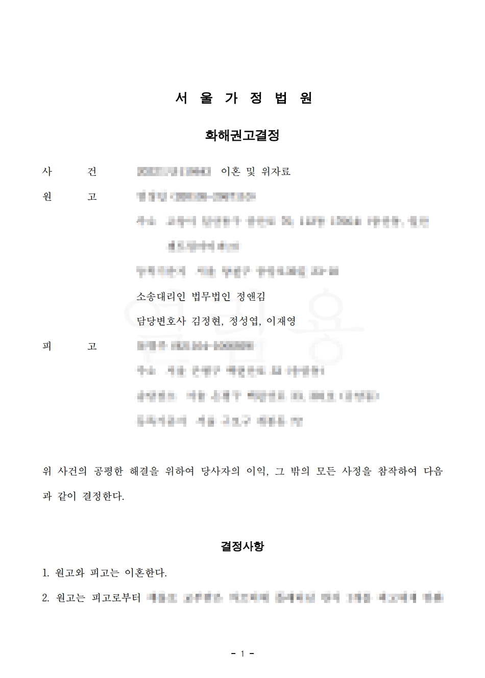 의뢰인을 도와 이혼소송을 제기하였고, 소장 송달 후 약 2주만에 해외 체류 등으로 별거하던 배우자로부터 이혼에 합의한다는 의사를 전달받아 쌍방의 의견을 기초로 이혼 조정안을 제출하여 소 제기 이후 한달여 만에 조정안을 제출, 2주 후에 화해권고결정을 내려져 소 제기 후 한달반만에 이혼이 성립되었습니다.
