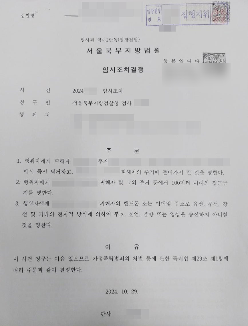 피고소인은 태권도 유단자로 180cm가 넘는 체격의 소유자이며, 왜소한 피해자의 몸에 올라타 목을 조르는 등의 폭행으로 고소인은 생명의 위협을 느낀 바 있다는 점, 이혼소송을 준비 중으로 이후에 보복이 우려된다는 점을 고려하여 수사하여 주기를 수사기관에 강력하게 요청하였습니다. 이를 통하여 피고소인은 주거지로부터 2개월간 퇴거하고, 주거 등에서 100미터 이내의 접근금지, 연락금지 임시조치 결정을 받아내었습니다.