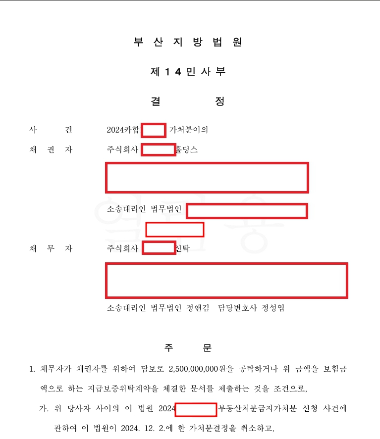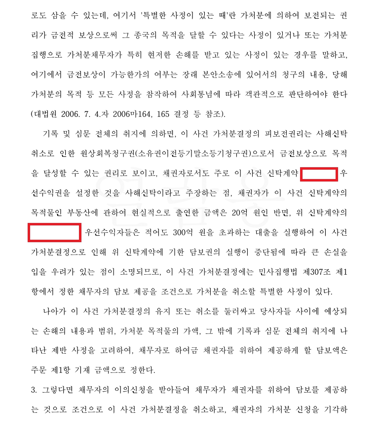 * 위 사안에서 채무자는 600억 원을 초과하는 이 사건 부동산에 관한 공매가 진행되어 매수인이 확정된 상태에서 2024. 12. 31.까지 가처분결정을 취소하지 못할 경우 매수인으로부터 매매계약을 진행하지 않겠다는 의사를 전달받은 상태였습니다.