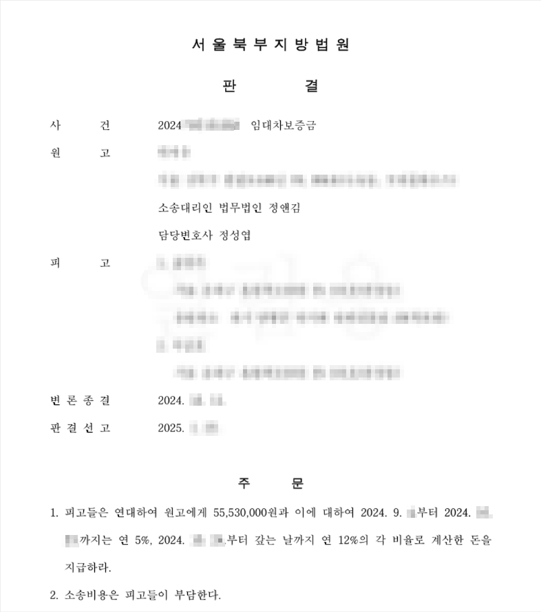 피고들은 공동하여 원고에게 55,530,000원(= 임대차보증금 55,000,000원 + 도어락수리비 23만 원 + 이사비용 30만 원) 및 이에 대한 2024. 9. 4.부터 이 사건 소장부본 송달일까지는 민법이 정한 연 5%의, 그 다음 날부터 다 갚는 날까지는 소송촉진등에관한특례법이 정한 연 12%의 각 비율로 계산한 돈을 지급하라.