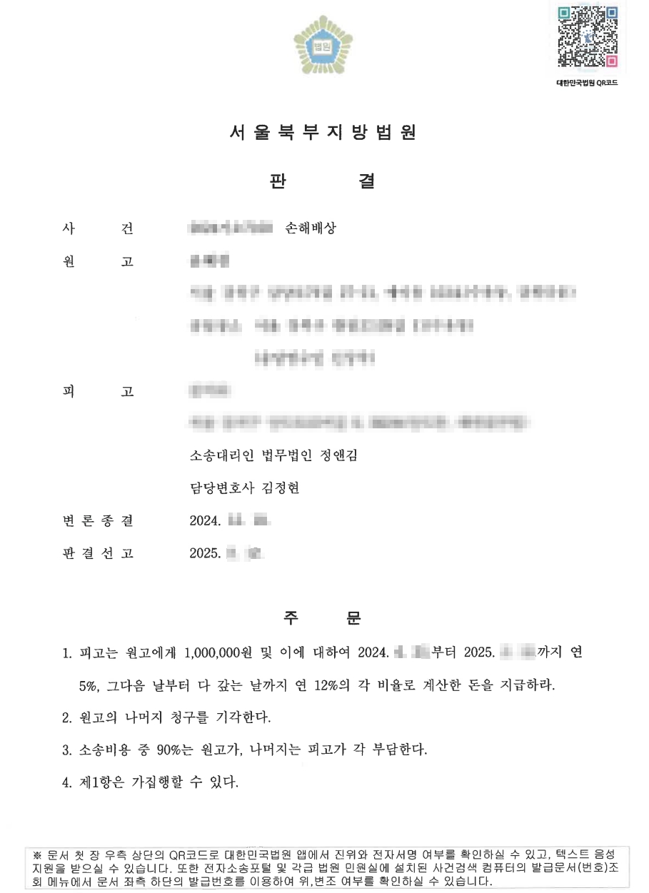 법무법인 정앤김의 주장에 따라 재판부는 불법행위의 경위와 내용 등 변혼에 나타난 여러 사정을 참작하여 원고의 청구금액에서 대폭 감액한 100만 원만을 손해배상액으로 인정하였습니다. 특히 재판부는 소송비용 분담에 있어 9/10에 해당하는 부분을 원고가 부담하도록 결정하여 손해배상액이 일부 인정되었음에도 의뢰인은 사실상 비용을 돌려받게 되었습니다.