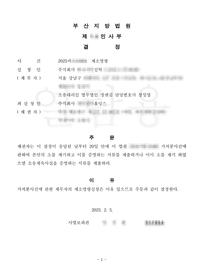 법무법인 정앤김의 김정현, 정성엽, 이재영 변호사는, 아래와 같은 근거로 제소명령 결정을 받을 수 있었습니다.